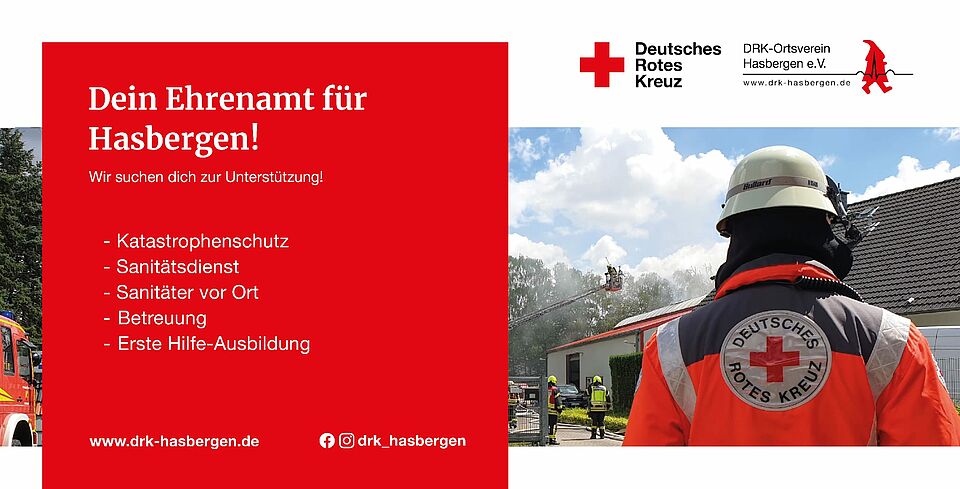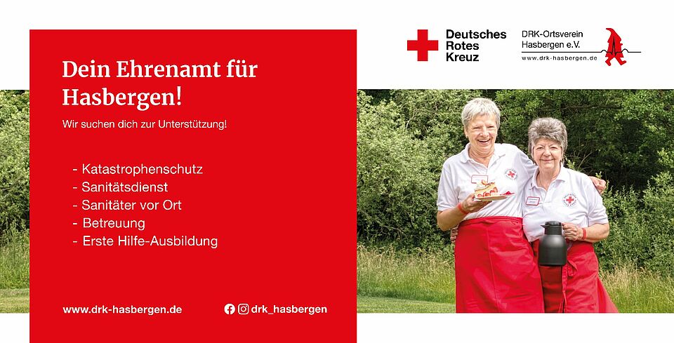 Wir suchen neue ehrenamtliche Helferinnen und Helfer für unsere gemeinnützige Arbeit in Hasbergen. Doch auch über die Grenzen unseres Heimatortes hinaus, ist unser DRK Ortsverein Hasbergen mit seinen ca. 30 aktiven Helferinnen und Helfern sehr aktiv!