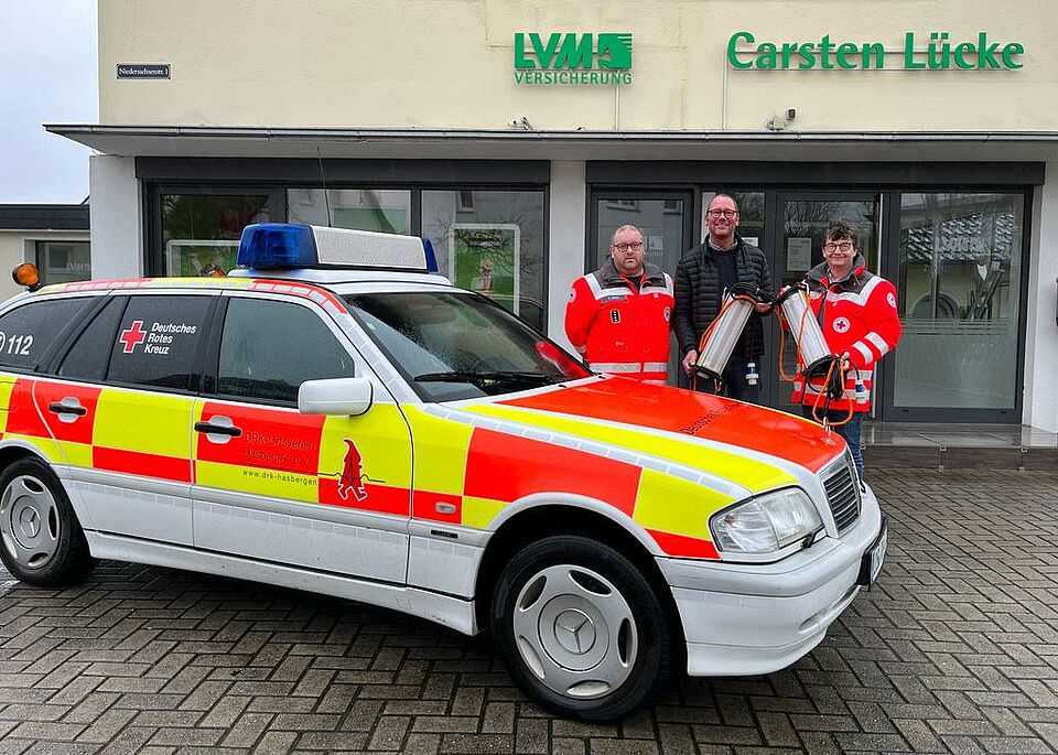 Die LVM Versicherungsagentur Carsten Lücke hat aus diesem Grunde schon im November des vergangenen Jahres ihre Hilfe angeboten. Nach einem kurzen Gespräch über den Sinn und Zweck der benötigten Ausrüstungsgegenstände sicherte Carsten Lücke umgehend seine Hilfe zu. „Mir gefällt vor allem der gemeinsame Einsatzzweck von Rotem Kreuz und der Feuerwehr, wenn die Feuerwehr bei langen Einsätzen verpflegt werden müsse, berichtet Carsten Lücke.“ Bei der Spendenübergabe wurde noch einmal auf die Merkmale einer qualitativ hochwertigen Zeltbeleuchtung eingegangen. Diese kann zum Beispiel auch bei starkem Regen und unter widrigen Bedingungen eingesetzt werden, ohne Schaden zu nehmen.